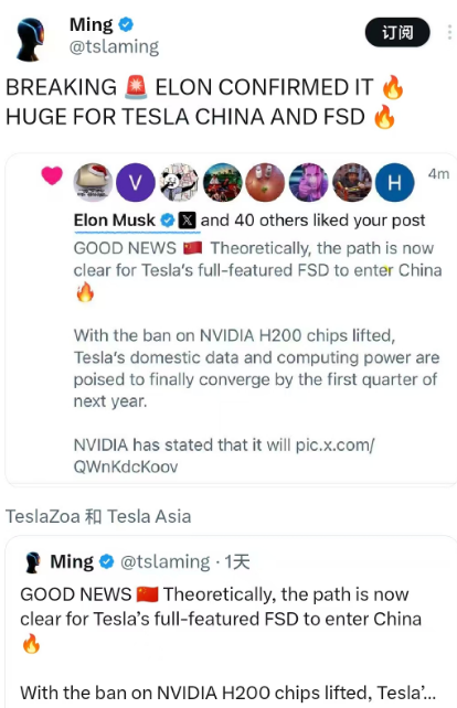 【CNMO科技消息】近日,一位海外博主发布推文称,特斯拉全功能FSD(完全自动驾驶能力)进入中国市场的路径已基本打通,并获得特斯拉CEO埃隆·马斯克点赞。该推文指出,随着英伟达H200芯片对华供应限制的解除,特斯拉有望在2026年第一季度实现本地数据与算力资源的闭环整合,为FSD在中国的全面落地扫清技术障碍。