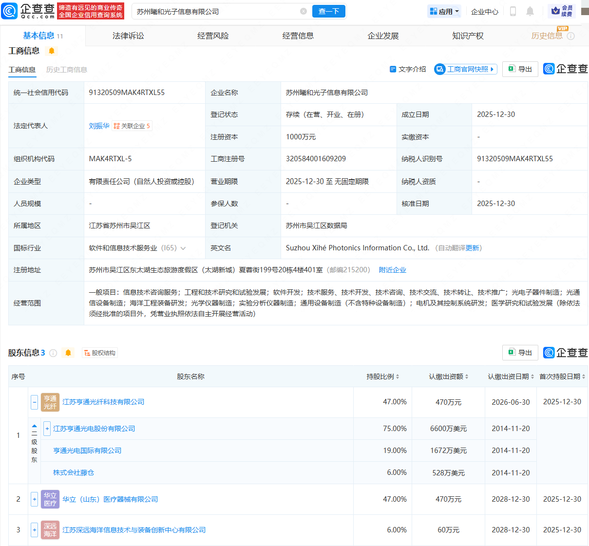 近日,苏州曦和光子信息有限公司成立,法定代表人为刘振华,注册资本为1000万元,经营范围包含:光电子器件制造;光通信设备制造;海洋工程装备研发;光学仪器制造等。企查查股权穿透显示,该公司由亨通光电(600487)旗下江苏亨通光纤科技有限公司、华立(山东)医疗器械有限公司等共同持股。